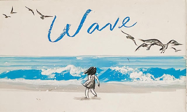 Wave is a deceptively simple story about a girl and a wave and the fun they have at the beach. Throughout the story, the girl creeps toward the sea, taunting it, daring it to come closer, before crossing the page to splash in the surf. As the wave grows, she runs back to the beach, sticks out her tongue at it, and gets clobbered. Nature has won, but left her with a consolation prize in the smattering of shells left on the beach. Although I did not notice them at first (my daughter did), the seagulls are a funny addition to the story. They mimic the girl in her taunts, but also know when the wave is going to crash on her, and get out of the way. Using bold lines, only 2 colors, and page spreads wisely, Suzy Lee is able to masterfully tell a universal story of childhood joy, and the power of nature.
