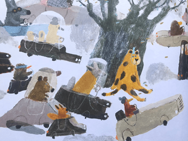 This charming picture book combines the usual themes of friendship and compassion with an important environmental message reminding us that new technologies are not always better. Shaloshvili’s minimalistic and slightly chaotic illustrations paradoxically enough create the feeling of harmony and unitedness. Using watercolour pencils and acrylic, she invents charismatic and amusing characters for readers of all ages to fall in love with.