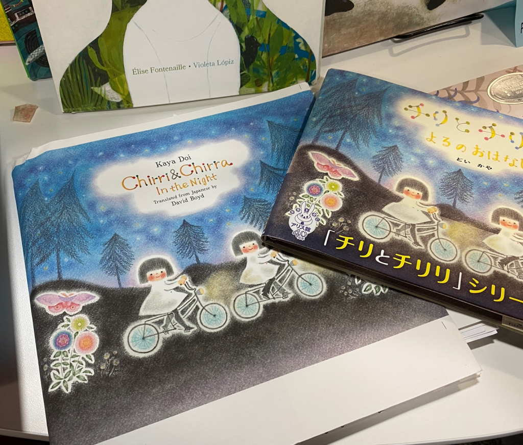 The Chirri & Chirra series is a confectionary delight. The vibrant color of Kaya Doi’s joyful pencil drawings are showcased on heavyweight paper, (just the size of an artist’s sketchbook) giving the feel that Enchanted Lion Books is entrusting the reader with the original. Nature and animals are a hallmark of this wonderful Japanese series. David Boyd’s translation of the twins’ adventure, never without their bikes, invites a new audience to explore the imaginative world that Kaya Doi has created. Previous titles have only a glimpse or two of cats, but Chirri & Chirra, In the Night is a cat-focused adventure and one that Chirri & Chirra fans don’t want to miss. If you are new to Chirri & Chirra, each book stands alone, so this is a perfect place to start. I am sure that readers will want to recreate the magical drink and cookies, and, of course, reading with your cat ears on only adds to the fun.