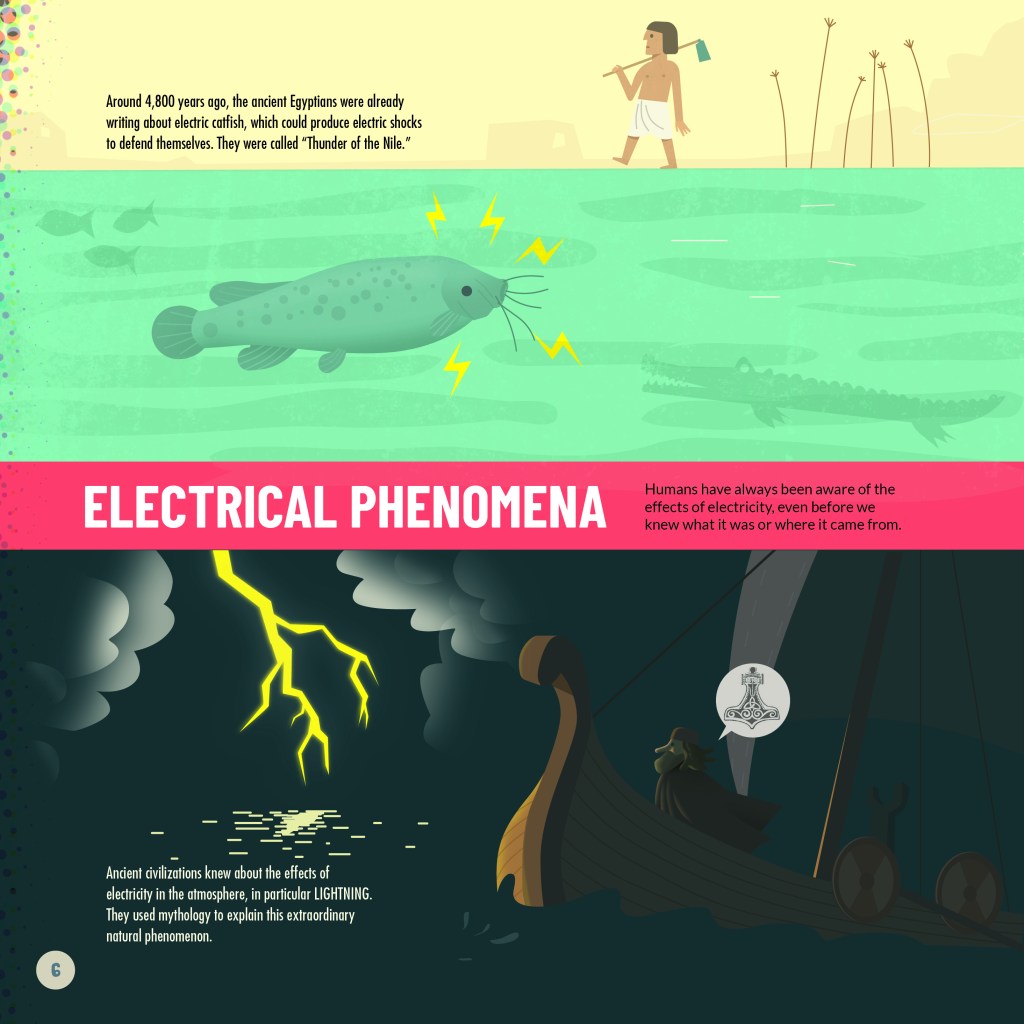 The first was an image of an electric eel in the introduction to electricity. The text claimed that the Ancient Egyptians referred to the eel as Trueno del Nilo (Thunder of the Nile). When I researched this in English, I found that Thunder of the Nile referred to an electric catfish rather than an eel. I was worrying about how I would get round this issue with words, so I spoke to Sheddad, who checked and found that the Spanish also referred to a catfish, not an eel. Eduard simply drew a replacement image. Easy to do when the book hasn’t yet been published!
