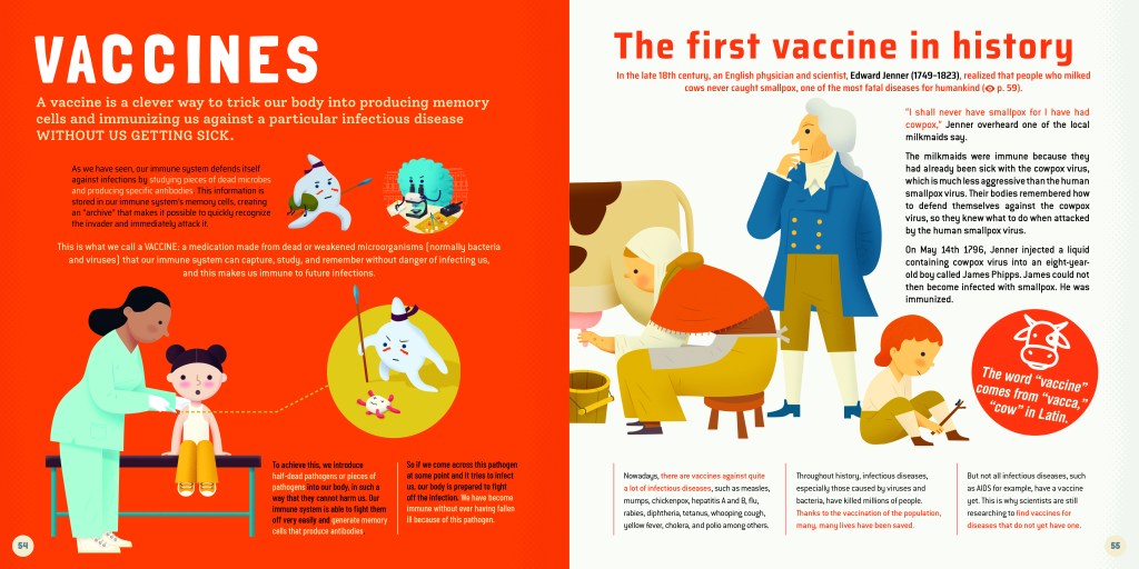 In My First Book of Microbes, there is an example of a vocabulary and space challenge in a small insert. The Spanish version explains that the word vaccine comes from the word ‘vaca’ (‘cow’ in Spanish), and is accompanied by an image of a cow’s face. This page also tells us about cowpox so it would be a shame to lose the image but what to do? In the end, research revealed that the Latin for ‘cow’ is ‘vacca’, allowing us to retain the reference. Phew! However, my first draft – The word “vaccine” comes from “vacca” which is Latin for cow” – was 25 characters longer than the original so needed reducing to fit in.