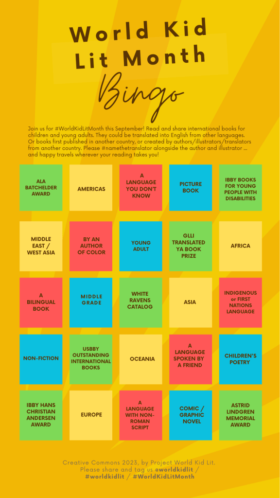 You can download this bingo chart as a PDF or PNG over on the World Kid Lit Month Resources page. Or make your own!