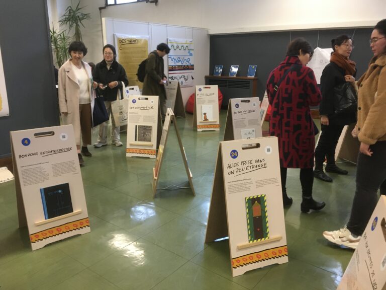We wanted to reflect this effect in the exhibition, highlighting the fact that children and adults are not in the same position when faced with a written object. But in the exhibition, it’s the child who is privileged! Indeed, we didn’t provide translations of the picturebooks, which the adult could have read aloud to the child, preserving his or her “authority” and cognitive superiority. Instead, we favored audio access, with a QR code allowing the child to listen to a voice telling the story from their parent’s phone. Of course, the adult can also listen, but in this case, the adult is also in the same position as the child–being read to.