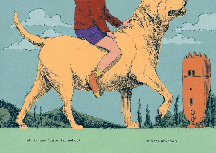 The art of Sunday is as magical as the imaginary places that main character Martin and his trusty dog Maize visit. From the very first endpaper, readers are invited to step into the world Tolentino has created, and then are easily carried along with Martin, who literally sits atop Maize, a wistful pooch whose expressions tell readers all they need to know about this family’s dynamics. As Marcelo Tolentino notes in an interview with Blue Dot Kids Press, “I hope that through this book, children come to view boredom and idleness as essential elements for creativity. Additionally, I wish for them to recognize the magic in ordinary aspects of daily life.”