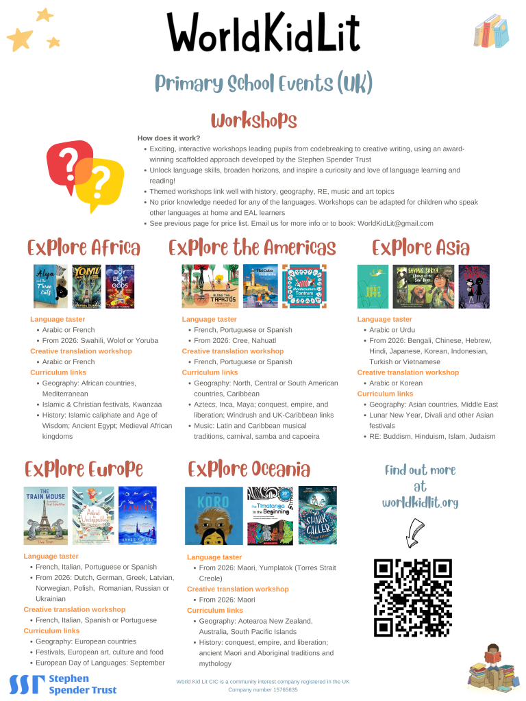 From September 2025, we’re offering creative translation workshops, language tasters and read the world assemblies to schools across the UK, in partnership with the Stephen Spender Trust.