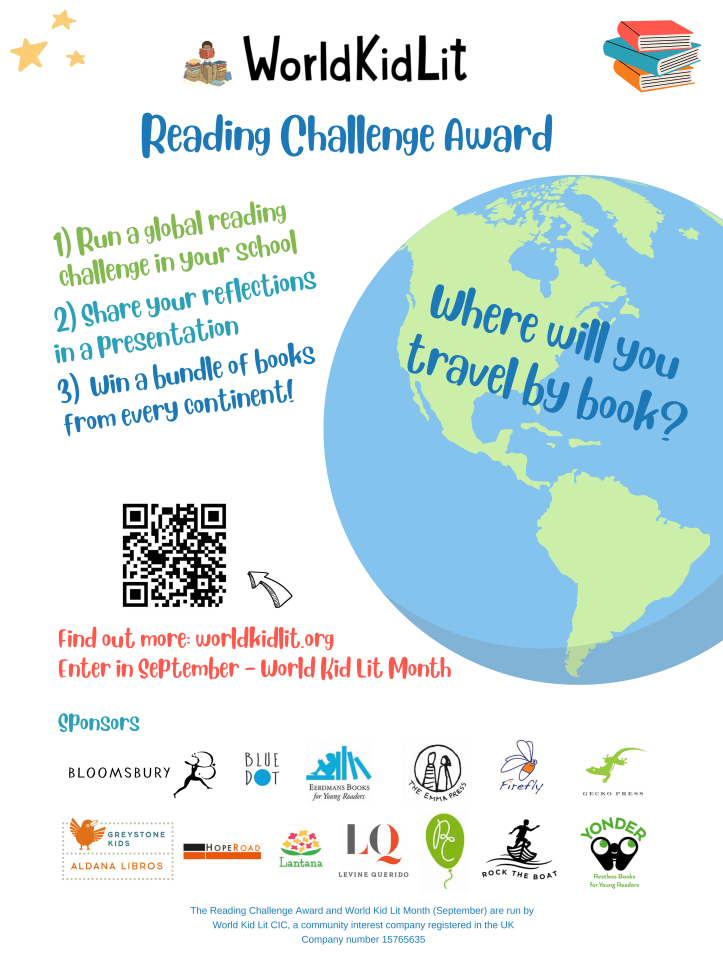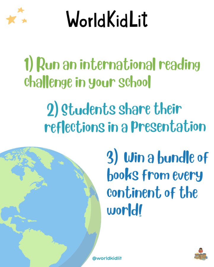 Here is a PDF with 2 short blurbs (about World Kid Lit Month, and the Reading Challenge Award for schools), as well as suggested tweets / wording for social media